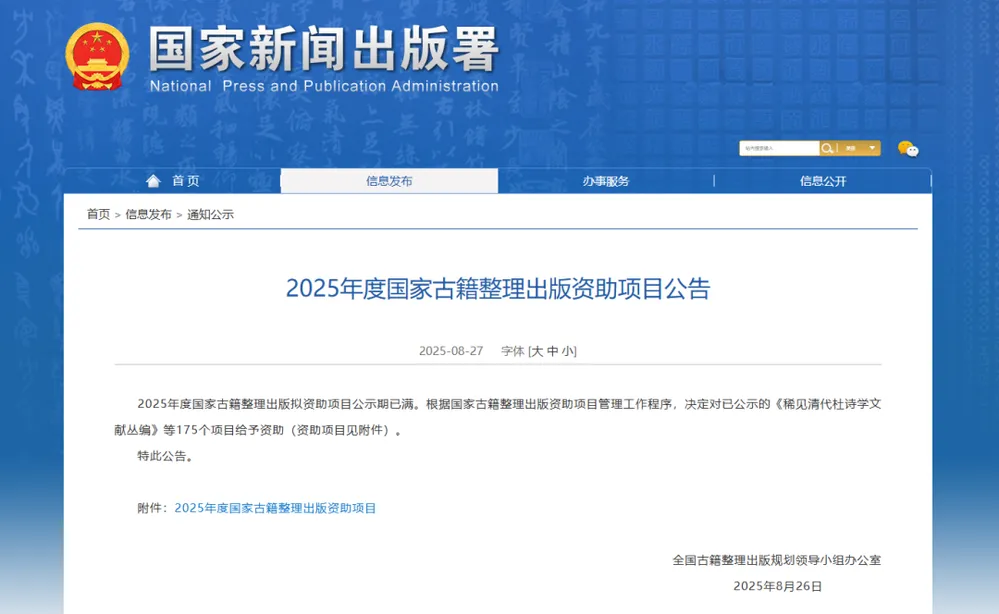 8月26日,国家新闻出版署全国古籍整理出版规划领导小组办公室公布了“2025年度国家古籍整理出版资助项目名单”(点击查看完整名单),全国共有175个项目入选。