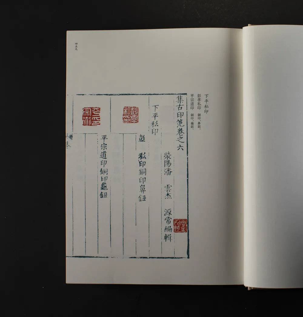 《集古印范》,明万历三十五年(1607)潘云杰辑,底本藏于西泠印社。潘云杰,字源常,河南荥阳人,善书法,精于篆隶。潘氏虑及木刻印谱所载印章“神气都尽,去古远矣”,于是出家藏古印并仿《印薮》,请当时篆刻名手苏宣、杨当时摹刻,辑成是谱。全谱共十卷,共收印2400余方,先官印,后私印,每印均在下方注明印文及钮制,版框及版刻文字均为蓝印。