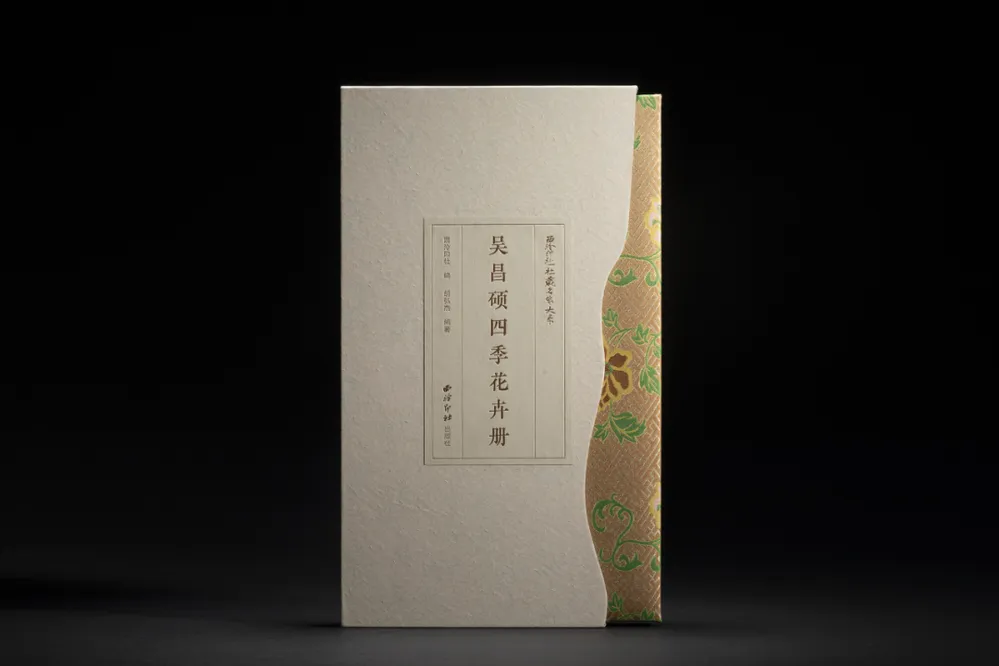 吴昌硕绘画的构图喜用对角线形式,构图在此册页中尤为典型,其所画菊花、幽兰、牵牛花等多从左下向右斜升而上,营造出一种升腾之势。本书另有一附册,所录为总序、作者序言、释文,便于读者感受原貌。在装帧设计上,此文物原本裱装的锦缎封面和封底,历经磨损,已无法清晰可辨,本书采用定制复原锦缎,将“墨池点破秋冥冥,苦铁画气不画形”原大原色还原给读者。本书书纵32厘米,横19厘米,蝴蝶装对折接页,希望读者能在四季流转中品读出小中见大之趣。
