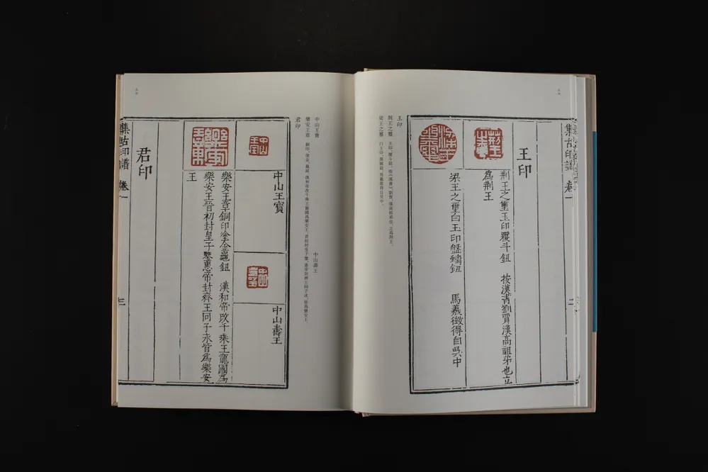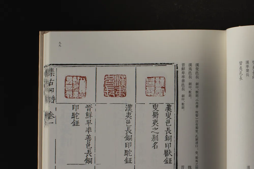 《集古印谱附印正附说》,明万历二十四年(1596)甘旸摹刻古印钤盖而成,底本藏于国家图书馆。甘旸,字旭甫,号寅东,秣陵(今江苏南京)人,隐居鸡笼山。精书法,尤擅篆书,篆刻宗秦汉。全谱分两部分:前五卷是甘旸摹古印谱,卷一为官印,卷二至卷五为私印;第六卷为甘旸印学理论著作《印正附说》。全谱收印1200余方,每印下方以版印方式注明释文和钮式。