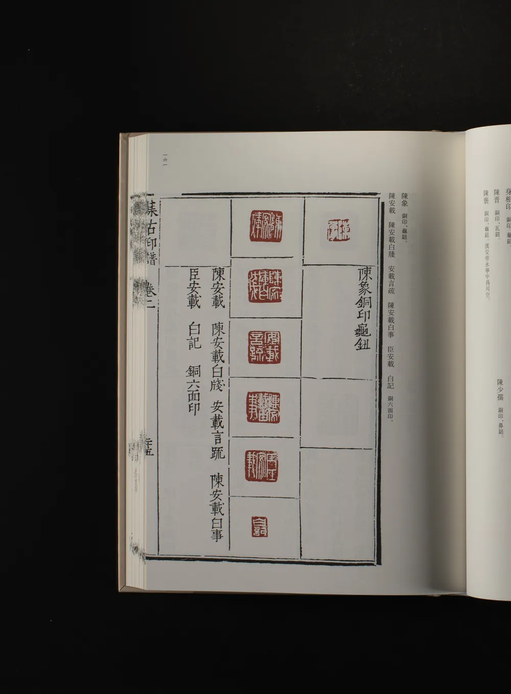 《陈氏古印选》,成于明万历三十三年(1605),为陈钜昌摹古印谱,底本藏于西泠印社。陈钜昌,字懿卜,华亭(今属上海)人,善篆刻,主持刊刻多部法帖,与董其昌为儿女姻亲。全谱分四卷,卷一为秦汉小玺及汉官印,卷二、三为白文私印,卷四为朱文印、阴阳文印等,每印下有释文,间附印材、钮制、注释。全谱收印780余方。
